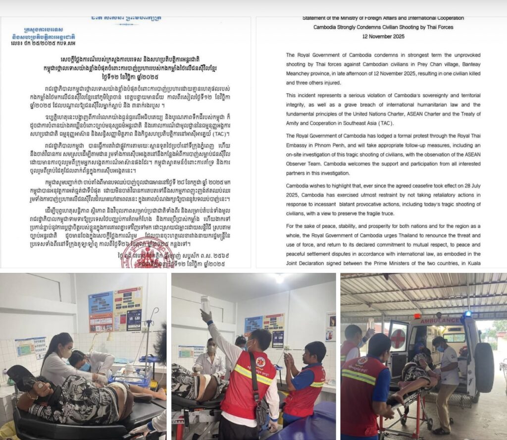 ភ្នំពេញ៖រាជរដ្ឋាភិបាលកម្ពុជា នៅថ្ងៃទី១២ ខែវិច្ឆិកា ឆ្នាំ២០២៥នេះ បានថ្កោលទោសយ៉ាងខ្លាំងបំផុតចំពោះការបាញ់ប្រហារដោយគ្មានហេតុផលរបស់ កងកម្លាំងថៃមកលើជនស៊ីវិលខ្មែរនៅភូមិព្រៃចាន់ ខេត្តបន្ទាយមានជ័យ កាលពីរសៀលថ្ងៃទី១២ ខែវិច្ឆិកា ឆ្នាំ២០២៥ ដែលបណ្តាលឱ្យជនស៊ីវិលម្នាក់ស្លាប់ និង ៣នាក់រងរបួស។ នេះបើតាមសេចក្តីថ្លែងការណ៍របស់ក្រសួងការបរទេស។
