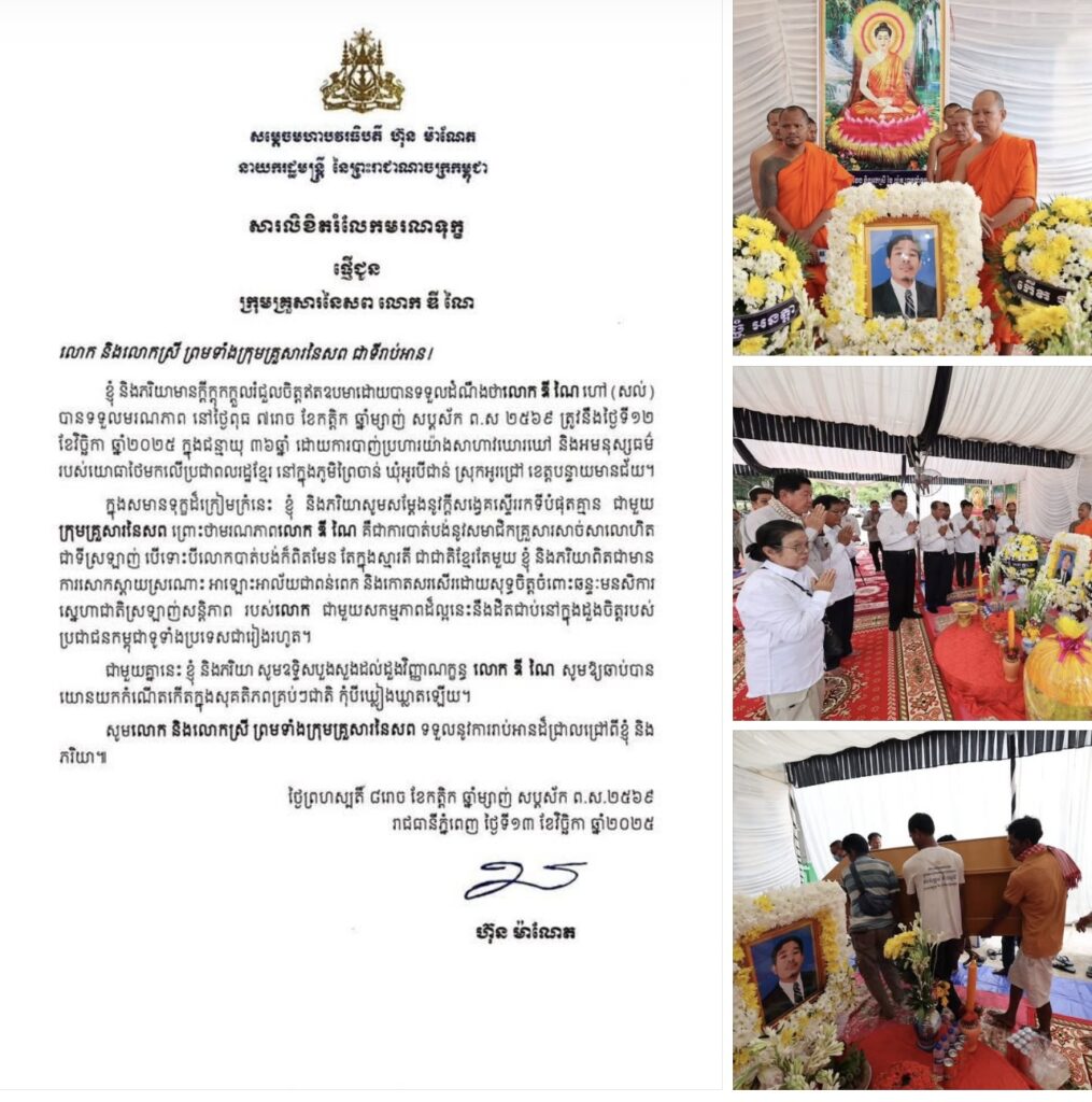 ភ្នំពេញ៖សម្ដេចបវរធិបតី ហ៊ុន ម៉ាណែត នាយករដ្ឋមន្ដ្រីនៃកម្ពុជា បានផ្ញើសារលិខិតរំលែកមរណទុក្ខ ជូនក្រុមគ្រួសារនៃសព របស់លោក ឌី ណៃ ដែលបានទទួលមរណភាព នៅថ្ងៃទី១២ ខែវិច្ឆិកា ឆ្នាំ២០២៥ ក្នុងជន្មាយុ៣៦ឆ្នាំ ដោយការបាញ់ប្រហារយ៉ាងសាហាវឃោរឃៅ និងអមនុស្សធម៌ របស់យោធាថៃមកលើប្រជាពលរដ្ឋខ្មែរ នៅក្នុងភូមិព្រៃចាន់ ឃុំអូរបីជាន់ ស្រុកអូរជ្រៅ ខេត្តបន្ទាយមានជ័យ។