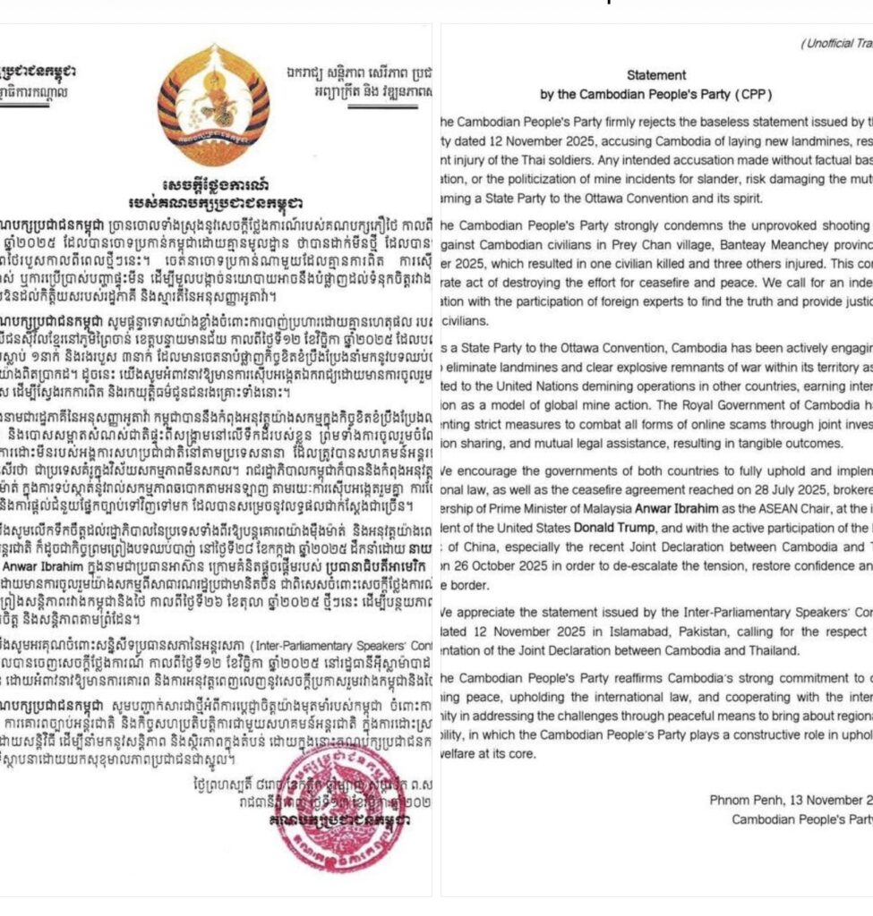 សេចក្តីថ្លែងការណ៍ របស់គណបក្សប្រជាជនកម្ពុជាច្រានចោលទាំងស្រុងនូវសេចក្តីថ្លែងការណ៍របស់គណបក្សភឿថៃ កាលពីថ្ងៃទី១២ ខែវិច្ឆិកា ឆ្នាំ២០២៥