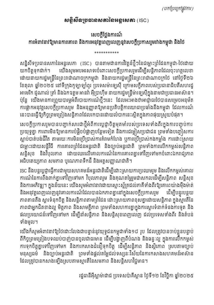 សន្និសីទប្រធានសភានៃអន្តរសភា (ISC) នឹងបន្តតាមដានការវិវត្តន៍ថ្មីៗនៃជម្លោះព្រំដែនកម្ពុជា-ថៃដោយយកចិត្តទុកដាក់ ហើយប្តេជ្ញាធ្វើការជាមួយសហគមន៍អន្តរជាតិ ដើម្បីដោះស្រាយការប្រឈមរួម និងលើកកម្ពស់គោលការណ៍នៃការពឹងពាក់គ្នាទៅវិញទៅមក វិបុលភាពរួម និងគុណតម្លៃរួមជាសកលដើម្បីសន្តិភាព សន្តិសុខ និងការអភិវឌ្ឍ។