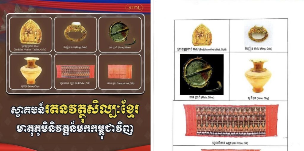 រតនវត្ថុសិល្បៈខ្មែរ រួមមាន៖ វាយនភណ្ឌសូត្រខ្មែរ ចំនួន ១៨៣ផ្ទាំង និងវត្ថុសម័យបុរេប្រវត្តិសាស្ត្រ ដូចជា៖ កាក់ អង្កាំ គ្រឿងអលង្ការ និងវត្ថុប្រើប្រាស់ធ្វើពីលោហធាតុមានតម្លៃ សំរិទ្ធ ថ្ម និងដីដុត ព្រមទាំងសមុច្ច័យសំខាន់ៗ ដូចជា៖ វត្ថុធ្វើអំពីថ្ម និងសំរិទ្ធ ក្នុងសម័យមុនអង្គរ និងសម័យអង្គរ គឺសុទ្ធសឹងជាកេរតំណែលពីបុព្វបុរសខ្មែរសម្រាប់កូនចៅជំនាន់ក្រោយ ដោយប្រៀបបាននឹងការវិលត្រឡប់នូវព្រលឹងដូនតាខ្មែរ៕