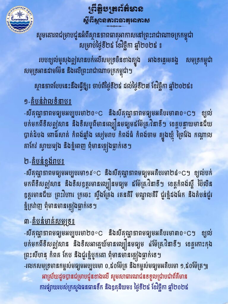 ភ្នំពេញ៖ក្រសួងធនធានទឹក និងឧតុនិយម បានចេញសេចក្តីជូនដំណឹង អំពីស្ថានភាពធាតុអាកាសនៅកម្ពុជា សម្រាប់ថ្ងៃទី២៥ ខែវិច្ឆិកា ឆ្នាំ២០២៥។