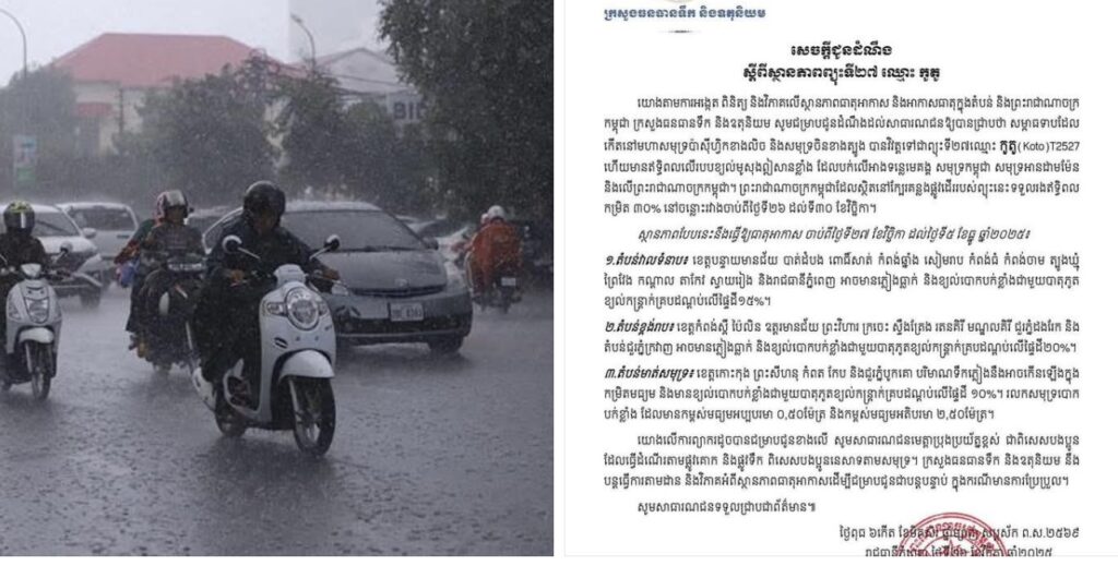 ក្រសួងបញ្ជាក់ថា សម្ពាធទាបដែលកើតនៅមហាសមុទ្រប៉ាស៊ីហ្វិកខាងលិច និងសមុទ្រចិនខាងត្បូង បានវិវត្តទៅជាព្យុះទី២៧ ឈ្មោះ កូតូ (Koto) T2527 ហើយមានឥទ្ធិពលលើរបបខ្យល់មូសុងឦសានខ្លាំង ដែលបក់លើអាងទន្លេមេគង្គ សមុទ្រកម្ពុជា សមុទ្រអានដាមម៉ែន និងលើព្រះរាជាណាចក្រកម្ពុជា។