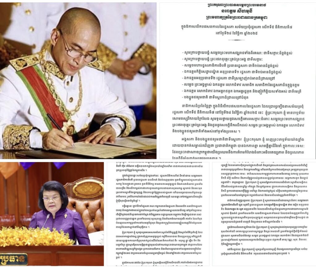 ភ្នំពេញ៖ក្នុងឱកាសបើកសម័យប្រជុំរដ្ឋសភា លើកទី៥ នីតិកាលទី៧ នៅព្រឹកថ្ងៃទី២៨ ខែវិច្ឆិកា ឆ្នាំ២០២៥នេះ ព្រះករុណា ព្រះបាទ សម្តេចព្រះ បរមនាថនរោត្តម សីហមុនី ព្រះមហាក្សត្រនៃព្រះរាជាណាចក្រកម្ពុជា ទ្រង់បានប្រទានព្រះរាជសារមួយដើម្បីអបអរសាទរដល់ការបើកសម័យប្រជុំនេះ។