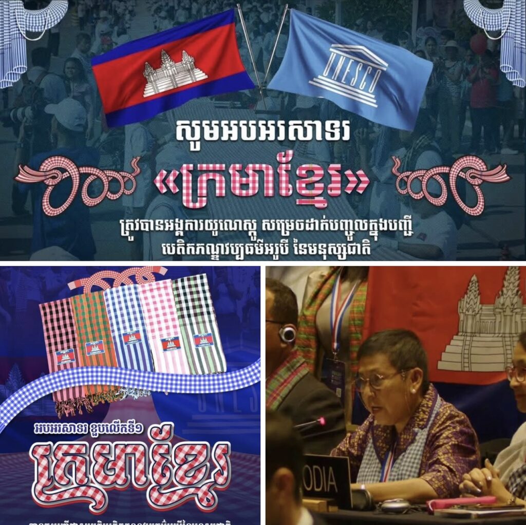 សូមជម្រាបថា ក្រមាខ្មែរ ត្រូវបានអង្គការយូណេស្កូ អនុម័តយល់ព្រមចុះក្នុងបញ្ជីតំណាង បេតិកភណ្ឌវប្បធម៌អរូបីនៃមនុស្សជាតិ តាមរយៈសេចក្តីសម្រេចលេខ 19.COM7.b.27 នាថ្ងៃពុធ ៤កើត ខែមិគសិរ ឆ្នាំរោង ឆស័ក ព.ស ២៥៦៨ ត្រូវនឹងថ្ងៃទី៤ ខែធ្នូ ឆ្នាំ២០២៤ នៅទីក្រុងអាសង់ស្យុង (Asunción) សាធារណរដ្ឋប៉ារ៉ាហ្គាយ (Republic of Paraguay)។