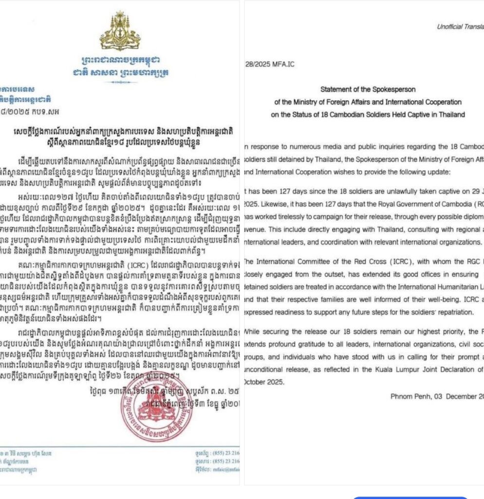 រាជរដ្ឋាភិបាលកម្ពុជា បន្តផ្តល់អាទិភាពខ្ពស់បំផុត ដល់ការជំរុញការដោះលែងយោធិនទាំង ១៨រូបរបស់យើង និងសូមថ្លែងអំណរគុណយ៉ាងជ្រាលជ្រៅ ចំពោះថ្នាក់ដឹកនាំ អង្គការអន្តរជាតិក្រុមសង្គមស៊ីវិល និងគ្រប់បុគ្គលទាំងអស់ ដែលបាននៅឈរជាមួយយើងក្នុងការអំពាវនាវឱ្យមានការដោះលែងយោធិនទាំង១៨រូប ដោយគ្មានបង្អែរបង្អង់ និងគ្មានលក្ខខណ្ឌ ដូចមានបញ្ជាក់នៅក្នុងសេចក្តីថ្លែងការណ៍រួមទីក្រុងគូឡាឡាំពួ ថ្ងៃទី២៦ ខែតុលា ឆ្នាំ២០២៥។