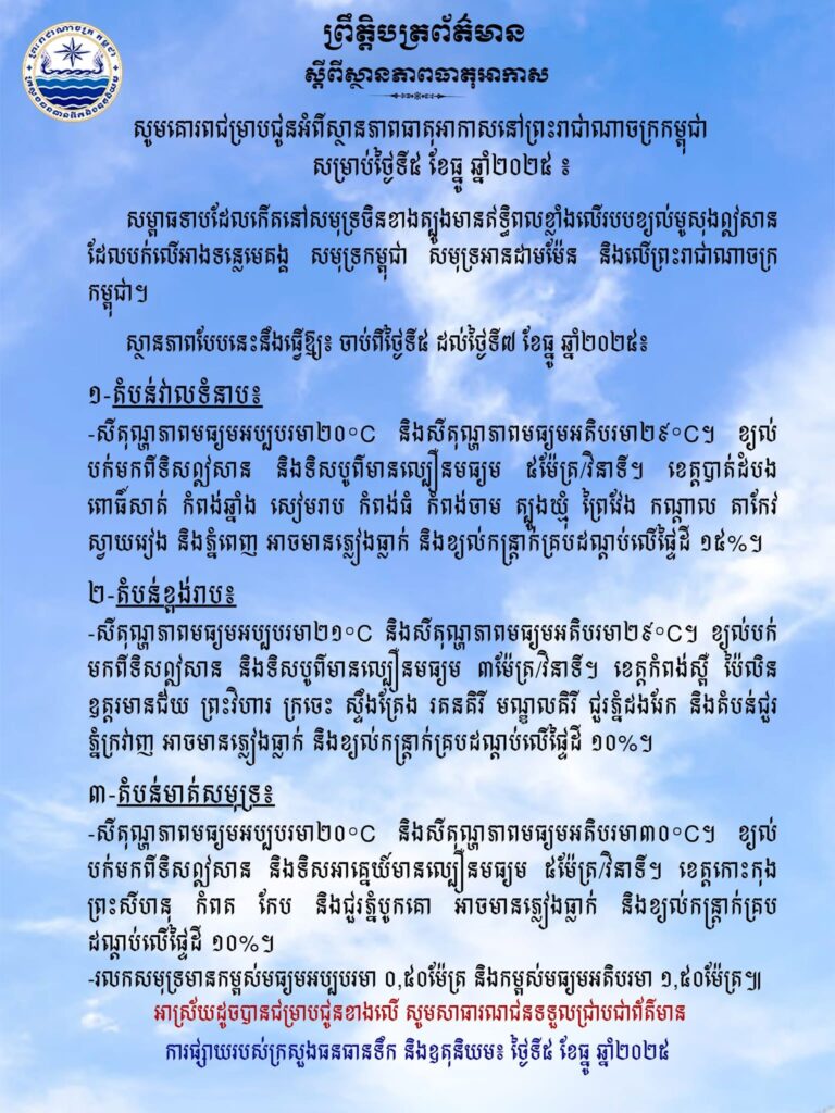 ភ្នំពេញក្រសួងធនធានទឹក និងឧតុនិយម បានចេញសេចក្តីជូនដំណឹង អំពីស្ថានភាពធាតុអាកាសនៅកម្ពុជា សម្រាប់ថ្ងៃទី៥ ខែធ្នូ ឆ្នាំ២០២៥។