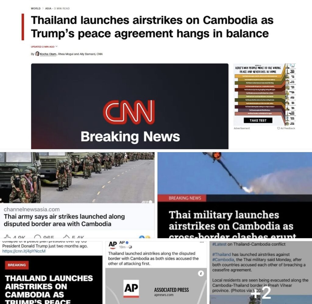 CNN)៖សារព័ត៌មានអាមេរិក CNN នៅព្រឹកថ្ងៃចន្ទ ទី៨ ខែធ្នូនេះបានដាក់ចំណងជើងធំៗថាថៃបានបើកការវាយប្រហារតាមផ្លូវអាកាសលើកម្ពុជា ខណៈភាពតានតឹងនៅតាមបណ្ដោយព្រំដែនរវាងប្រទេសទាំង២ ផ្ទុះឡើងសាជាថ្មីដែលនេះបាន និងកំពុងបង្កហានិភ័យនៃការដួលរលំកិច្ចព្រមព្រៀងសន្តិភាពដែលលោកប្រធានាធិបតីអាមេរិក ដូណាល់ ត្រាំ ជាអ្នកសម្របសម្រួលឡើងកាលជាង២ខែមុន។