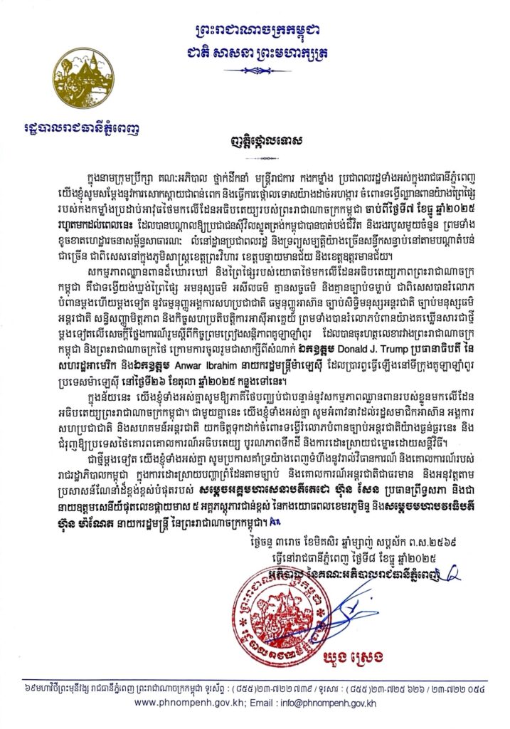 ភ្នំពេញ៖ឯកឧត្ដមឃួង ស្រេង អភិបាលរាជធានីភ្នំពេញក្នុងនាមក្រុមប្រឹក្សា គណៈអភិបាល ថ្នាក់ដឹកនាំ មន្ត្រីរាជការ កងកម្លាំង ប្រជាពលរដ្ឋទាំងអស់ក្នុងរាជធានីភ្នំពេញ យើងខ្ញុំសូមសម្តែងនូវការសោកស្តាយជាពន់ពេក និងធ្វើការថ្កោលទោសយ៉ាងដាច់អហង្ការ ចំពោះទង្វើល្អឈ្លានពានយ៉ាងព្រៃផ្សៃ របស់កងកម្លាំងប្រដាប់អាវុធថែមកលើដែនអធិបតេយ្យរបស់ព្រះរាជាណាចក្រកម្ពុជា ចាប់ពីថ្ងៃទី៧ ខែធ្នូ ឆ្នាំ២០២៥ រហូតមកដល់ពេលនេះ ដែលបានបណ្តាលឱ្យប្រជាជនស៊ីវិលស្លូតត្រង់កម្ពុជាបានបាត់បង់ជីវិត និងរងរបួសមួយចំនួន ព្រមទាំង ខូចខាតហេដ្ឋារចនាសម្ព័ន្ធសាធារណៈ លំនៅដ្ឋានប្រជាពលរដ្ឋ និងទ្រព្យសម្បត្តិយ៉ាងច្រើនសន្ធឹកសន្ធាប់នៅតាមបណ្តាតំបន់ ជាច្រើន ជាពិសេសនៅក្នុងភូមិសាស្ត្រខេត្តព្រះវិហារ ខេត្តបន្ទាយមានជ័យ និងខេត្តឧត្តរមានជ័យ។