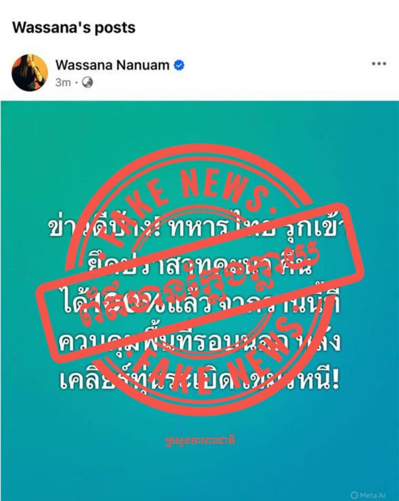 ភ្នំពេញក្រសួងការពារជាតិ បានបញ្ជាក់ថា ការផ្សព្វផ្សាយរបស់ អ្នកការសែតកងទ័ពថៃឈ្មោះ Wassana’s Nanuam ដែលថាទាហានថៃវាយលុកដណ្តើមយកប្រាសាទខ្នារ  មកវិញបានមកវិញ១០០ភាគរយ គឺជាព័ត៌មានក្លែងក្លាយ មិនពិត។