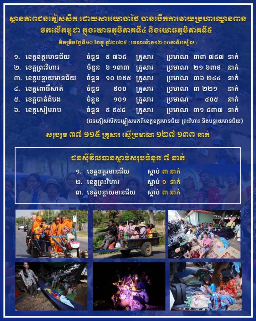ភ្នំពេញ៖ក្រសួងការពារជាតិកម្ពុជា បានបញ្ជាក់ឱ្យដឹងថា គិតត្រឹមម៉ោង ១២រសៀល ថ្ងៃទី១០ ខែធ្នូ ឆ្នាំ២០២៥នេះ កម្ពុជា មានជនស៉ីវិលបានស្លាប់បាត់បង់ជីវិតចំនួន ៧នាក់ និងមានជនភៀសសឹក បានកើនឡើងដល់ ៣៧ ១១៥គ្រួសារ សរុបប្រជាពលរដ្ឋ មានចំនួន ១២៧ ១៣៣នាក់ ដោយសារការឈ្លានពានរបស់ថៃ មកលើដែនអធិបតេយ្យភាពរបស់កម្ពុជា៕