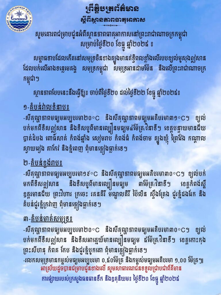 ភ្នំពេញ៖ក្រសួងធនធានទឹក និងឧតុនិយម បានចេញសេចក្តីជូនដំណឹង អំពីស្ថានភាពធាតុអាកាសនៅកម្ពុជា សម្រាប់ថ្ងៃទី២០ ខែធ្នូ ឆ្នាំ២០២៥។