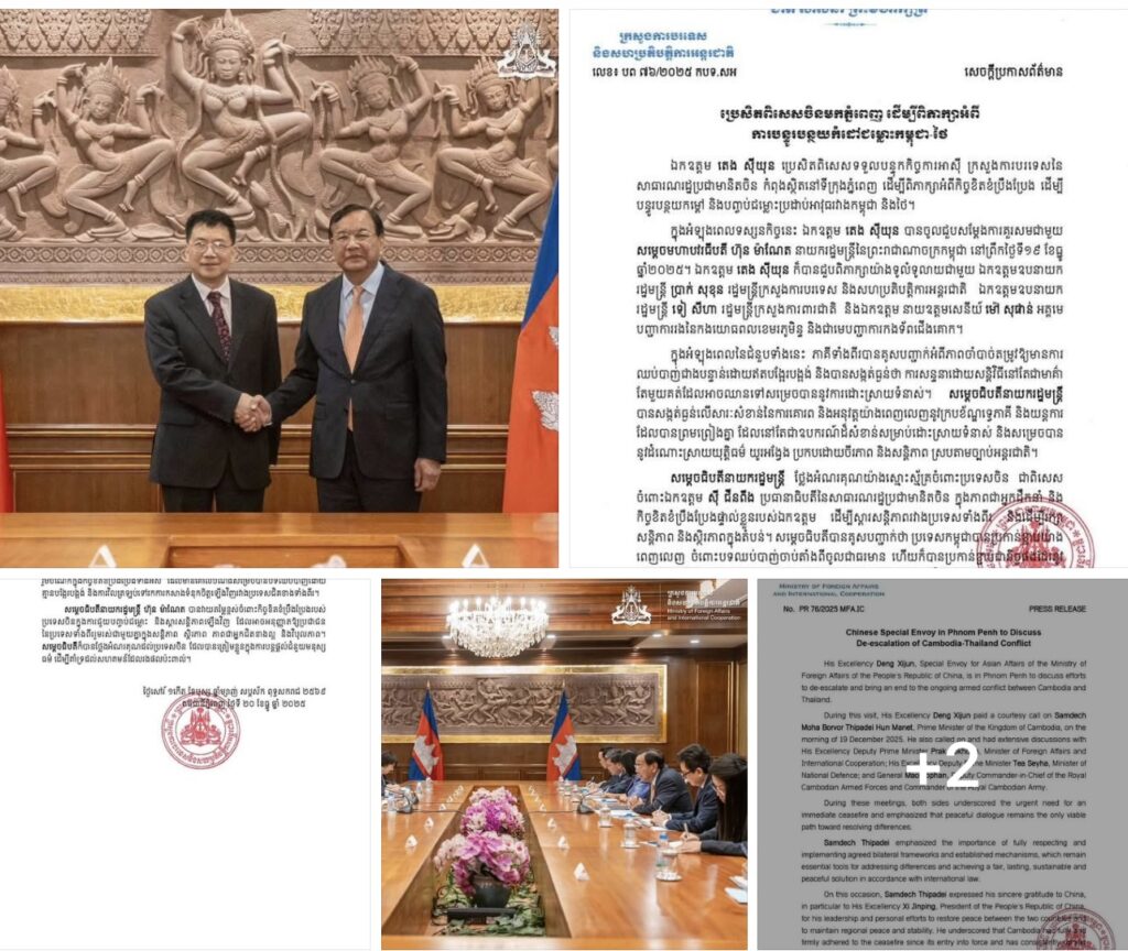 ភ្នំពេញ៖លោក តេង ស៊ីយុន បេកជនពិសេសទទួលបន្ទុកកិច្ចការអាស៊ី ក្រសួងការបរទេស នៃសាធារណរដ្ឋប្រជាមានិតចិន កំពុងស្ថិតនៅទីក្រុងភ្នំពេញ ដើម្បីពិភាក្សាអំពីកិច្ចខិតខំប្រឹងប្រែង ដើម្បីបន្ធូរបន្ថយកម្ដៅ និងបញ្ចប់ជម្លោះប្រដាប់អាវុធរវាងកម្ពុជា និងថៃ។ នេះបើតាមការប្រកាសរបស់ក្រសួងការបរទេស។