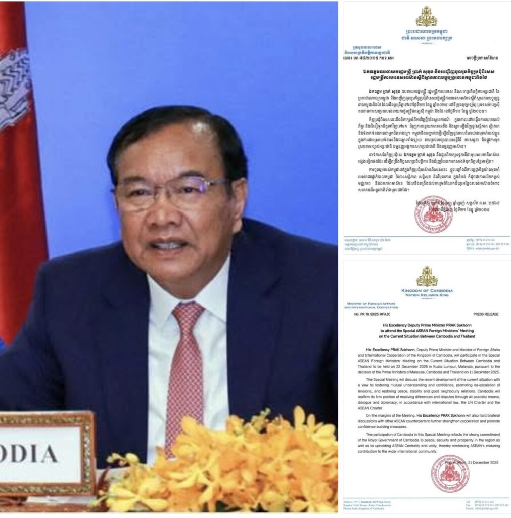 ភ្នំពេញ៖ឯកឧត្ដមឧបនាយករដ្ឋមន្ត្រី ប្រាក់ សុខុន រដ្ឋមន្ត្រីការបរទេស និងសហប្រតិបត្តិការអន្តរជាតិ នៃព្រះរាជាណាចក្រកម្ពុជា នឹងអញ្ជើញចូលរួមកិច្ចប្រជុំពិសេសរដ្ឋមន្ត្រីការបរទេសអាស៊ាន ស្តីពីស្ថានភាពបច្ចុប្បន្នរវាងកម្ពុជា និងថៃ ដែលនឹងប្រព្រឹត្តទៅនៅថ្ងៃទី២២ ខែធ្នូ ឆ្នាំ២០២៥ នៅទីក្រុងគូឡាឡាំពួ ប្រទេសម៉ាឡេស៊ី តបតាមការសម្រេចរបស់នាយករដ្ឋមន្ត្រីម៉ាឡេស៊ី កម្ពុជា និងថៃ នៅថ្ងៃទី១១ ខែធ្នូ ឆ្នាំ២០២៥។
