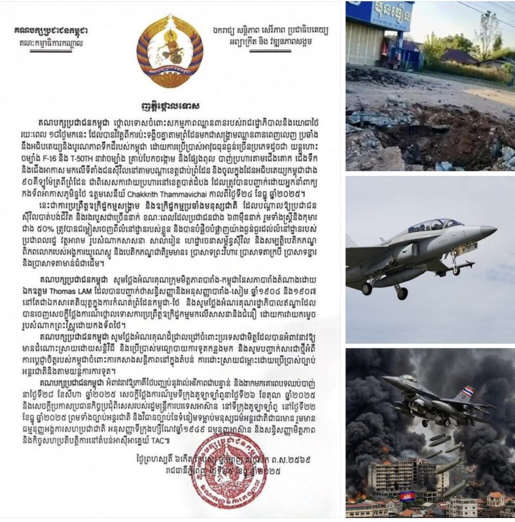 ការឈ្លានពានរបស់ថៃ ដោយបានប្រើប្រាស់អាវុធធុនតូច និងធុនធំ ដោយកំរោលនិងមិនរើសគោលដៅយ៉ាងសាហាវព្រៃផ្សៃ បានធ្វើឱ្យប្រជាជនស៊ីវិលកម្ពុជា មួយចំនួនរងរបួស ផ្ទះសម្បែងជាច្រើនខ្នងត្រូវបានបំផ្លាញ សិស្សសាលា ក្មេងចាស់ ប្រុសស្រីត្រូវបង្ខំចិត្តភៀសខ្លួនរកទីកន្លែងសុវត្ថិភាពបណ្តោះអាសន្នភ្លាមៗ។ ភាគីថៃម្តងហើយម្តងទៀត បានរំលោភបំពានលើបទឈប់បាញ់ និងសេចក្តីថ្លែងការណ៍រួមស្ដីពីកិច្ចព្រមព្រៀងសន្តិភាពរវាងកម្ពុជានិងថៃ ដែលភាគីទាំងពីរបានចុះហត្ថលេខាដោយ នាយករដ្ឋមន្ត្រីនៃប្រទេសកម្ពុជា និងថៃ ក្រោមសាក្សីរបស់ ឯកឧត្តម ដូណាល់ ត្រាំ ប្រធានាធិបតីសហរដ្ឋអាម៉េរិក និងឯកឧត្តម អាន់វ៉ា អ៊ីប្រាហ៊ីម នាយករដ្ឋមន្ត្រីម៉ាឡេស៊ី និងជាប្រធានប្តូរវេនអាស៊ាន។