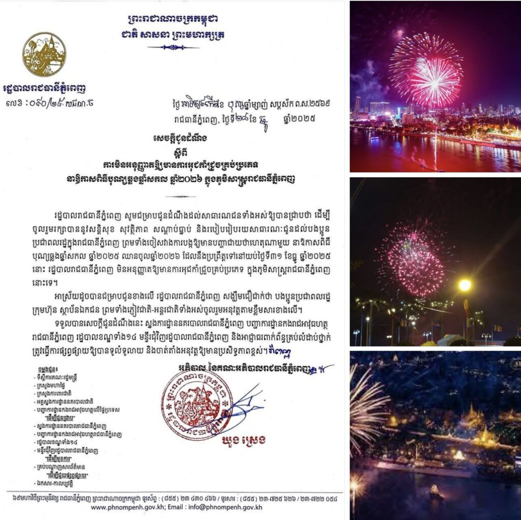 មិនអនុញ្ញាតឱ្យមានការអុជកាំជ្រួចគ្រប់ប្រភេទ នាឱកាសពិធីបុណ្យឆ្លងឆ្នាំសកល ឆ្នាំ២០២៦ ក្នុងភូមិសាស្រ្តរាជធានីភ្នំពេញ