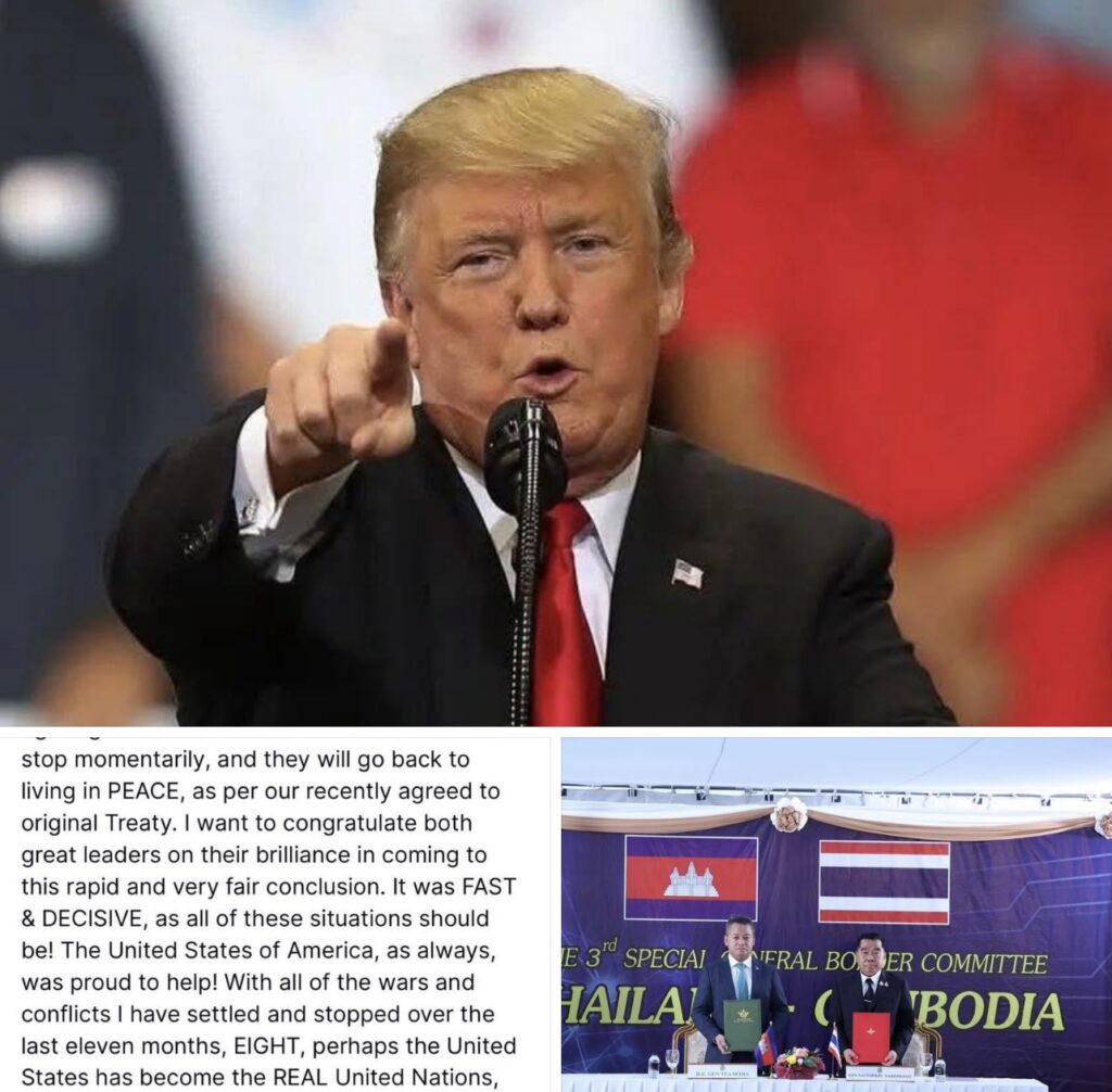 ប្រធានាធិបតីដូណាល់ត្រាំប្រកាសថាជម្លោះថៃ-កម្ពុជាបានបិទបញ្ចប់និងបានរិះគន់ UN យ៉ាងចាស់ដៃថាអសកម្ម