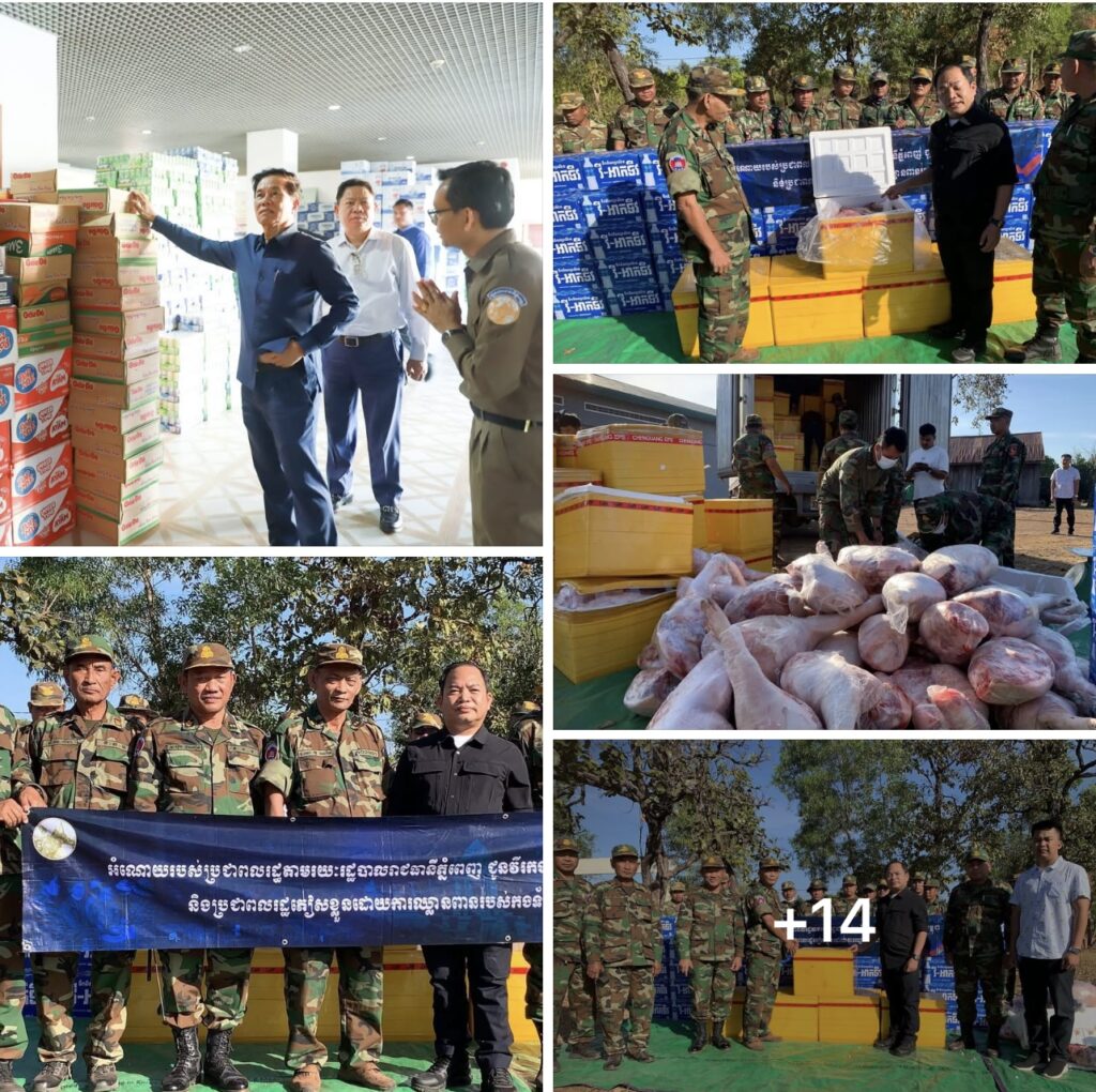 អំណោយជាសាច់ជ្រូក សាច់គោស្រស់ចំនួន៦តោននិងគ្រឿងឧបភោគ បរិភោគចំនួន៣១មុខរបស់សម្ដេចធិបតី និងលោកជំទាវបណ្ឌិត ផ្ដល់តាមរយៈរដ្ឋបាលរាជធានីត្រូវបានដឹកទៅប្រគល់ជូនដល់ដៃ វីរកងទ័ពជួមុខចំនួន៣គោលដៅនៅទិសខេត្តព្រះវិហារ