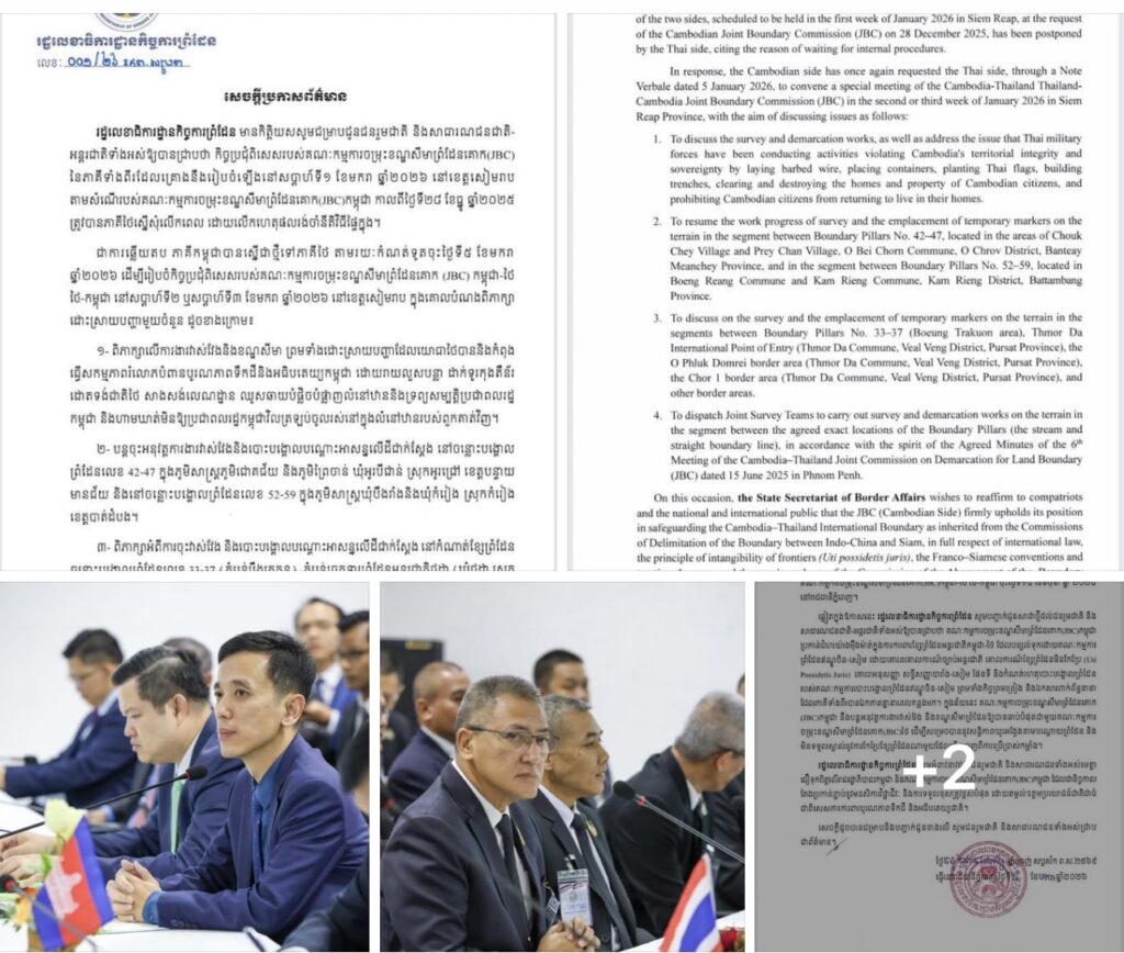 ភ្នំពេញ៖សេចក្ដីប្រកាសព័ត៌មាន របស់រដ្ឋលេខាធិការដ្ឋានកិច្ចការព្រំដែន ស្ដីពី កិច្ចប្រជុំពិសេសរបស់គណៈកម្មការចម្រុះខណ្ឌសីមា ព្រំដែនគោក (JBC) នៃភាគីទាំងពីរដែលគ្រោងនឹងរៀបចំឡើង នៅសប្តាហ៍ទី១ ខែមករា ឆ្នាំ២០២៦ នៅខេត្តសៀមរាប តាមសំណើរបស់គណៈកម្មការចម្រុះខណ្ឌសីមាព្រំដែនគោក(JBC)កម្ពុជា កាលពីថ្ងៃទី២៨ ខែធ្នូ ឆ្នាំ២០២៥ ត្រូវបានភាគីថៃ ស្នើសុំលើកពេល ដោយលើកហេតុផលរង់ចាំនីតិវិធីផ្ទៃក្នុង។
