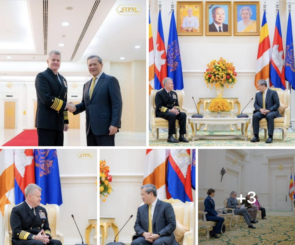 ភ្នំពេញ៖នៅព្រឹកថ្ងៃចន្ទ ទី២៦ ខែមករា ឆ្នាំ២០២៦នេះ សម្តេចមហាបវរធិបតី ហ៊ុន ម៉ាណែត នាយករដ្ឋមន្ត្រីកម្ពុជា អនុញ្ញាតឱ្យនាយឧត្តមនាវី Samuel Paparo មេបញ្ជាការនៃបញ្ជាការដ្ឋានឥណ្ឌូ-ប៉ាស៊ីហ្វិក នៃកងទ័ពជើងទឹកអាមេរិក ជួបសម្តែងការគួរសម និងពិភាក្សាការងារនៅវិមានសន្តិភាព។