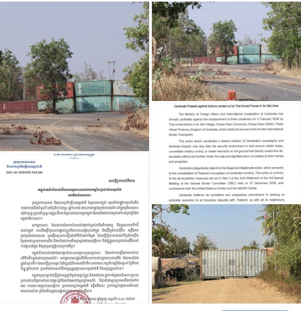 ភ្នំពេញ៖ក្រសួងការបរទេស និងសហប្រតិបត្តិការអន្តរជាតិ នៃប្រទេសកម្ពុជា បានប្រកាសតវ៉ាជាផ្លូវការប្រឆាំងនឹង ការដាក់កុងតឺន័រចំនួនបី នៅថ្ងៃទី៣ ខែកុម្ភៈ ឆ្នាំ២០២៦ ដោយកងកម្លាំងប្រដាប់អាវុធថៃ នៅក្នុងភូមិអានសេះ ឃុំជាំក្សាន្ត ស្រុកជាំក្សាន្ត ខេត្តព្រះវិហារ នៃព្រះរាជាណាចក្រកម្ពុជា ដែលរារាំងដល់ការចូលទៅកាន់ច្រកព្រំដែន អន្តរជាតិអានសេះ។