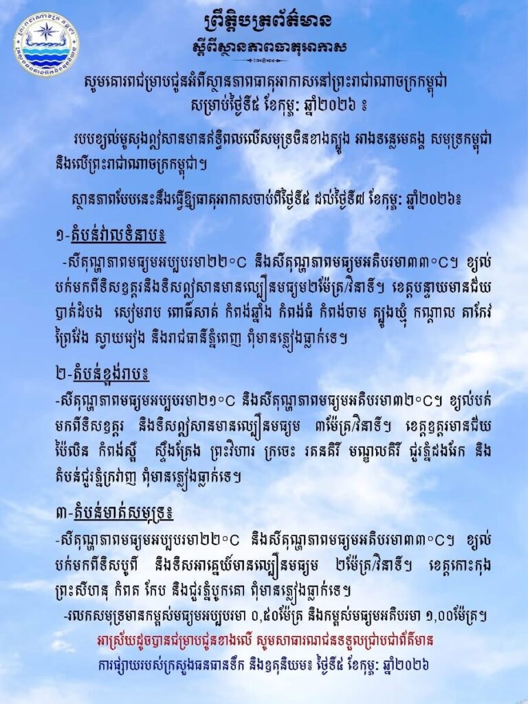 ភ្នំពេញ៖ក្រសួងធនធានទឹក និងឧតុនិយម បានចេញសេចក្តីជូនដំណឹង អំពីស្ថានភាពធាតុអាកាសនៅកម្ពុជា សម្រាប់ថ្ងៃទី៥ ខែកុម្ភៈ ឆ្នាំ២០២៦។