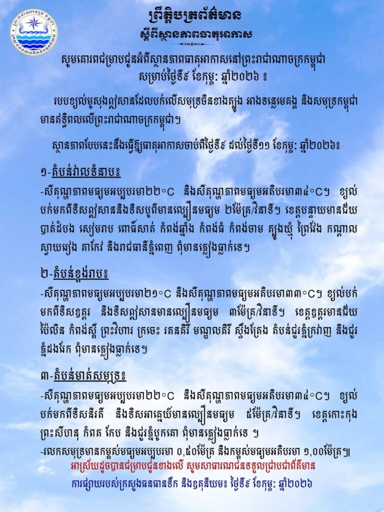 ភ្នំពេញ៖ក្រសួងធនធានទឹក និងឧតុនិយម បានចេញសេចក្តីជូនដំណឹង អំពីស្ថានភាពធាតុអាកាសនៅកម្ពុជា សម្រាប់ថ្ងៃទី៩ ខែកុម្ភៈ ឆ្នាំ២០២៦។