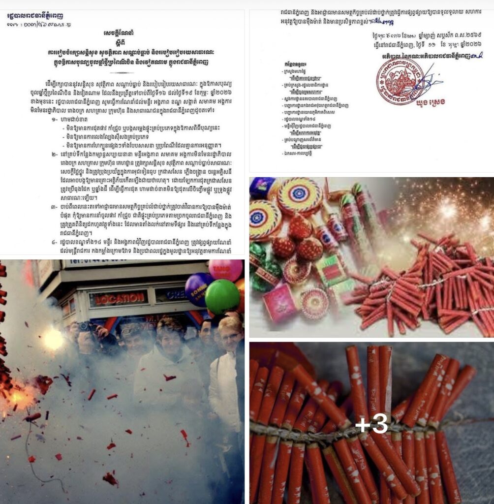 ដើម្បីរក្សាបាននូវសន្តិសុខ សុវត្ថិភាព សណ្តាប់ធ្នាប់ និងរបៀបរៀបរយសាធារណៈ ក្នុងឱកាសបុណ្យ ចូលឆ្នាំថ្មីប្រពៃណីចិន និងវៀតណាម ដែលនឹងប្រព្រឹត្តទៅចាប់ពីថ្ងៃទី១៦ ដល់ថ្ងៃទី១៩ ខែកុម្ភៈ ឆ្នាំ២០២៦ ខាងមុខនេះ រដ្ឋបាលរាជធានីភ្នំពេញ សូមធ្វើការណែនាំដល់មន្ទីរ អង្គភាព ខណ្ឌ សង្កាត់ សមាគម អង្គការ មិនមែនរដ្ឋាភិបាល រោងចក្រ សហគ្រាស ក្រុមហ៊ុន និងសាធារណជនក្នុងរាជធានីភ្នំពេញដូចតទៅ៖