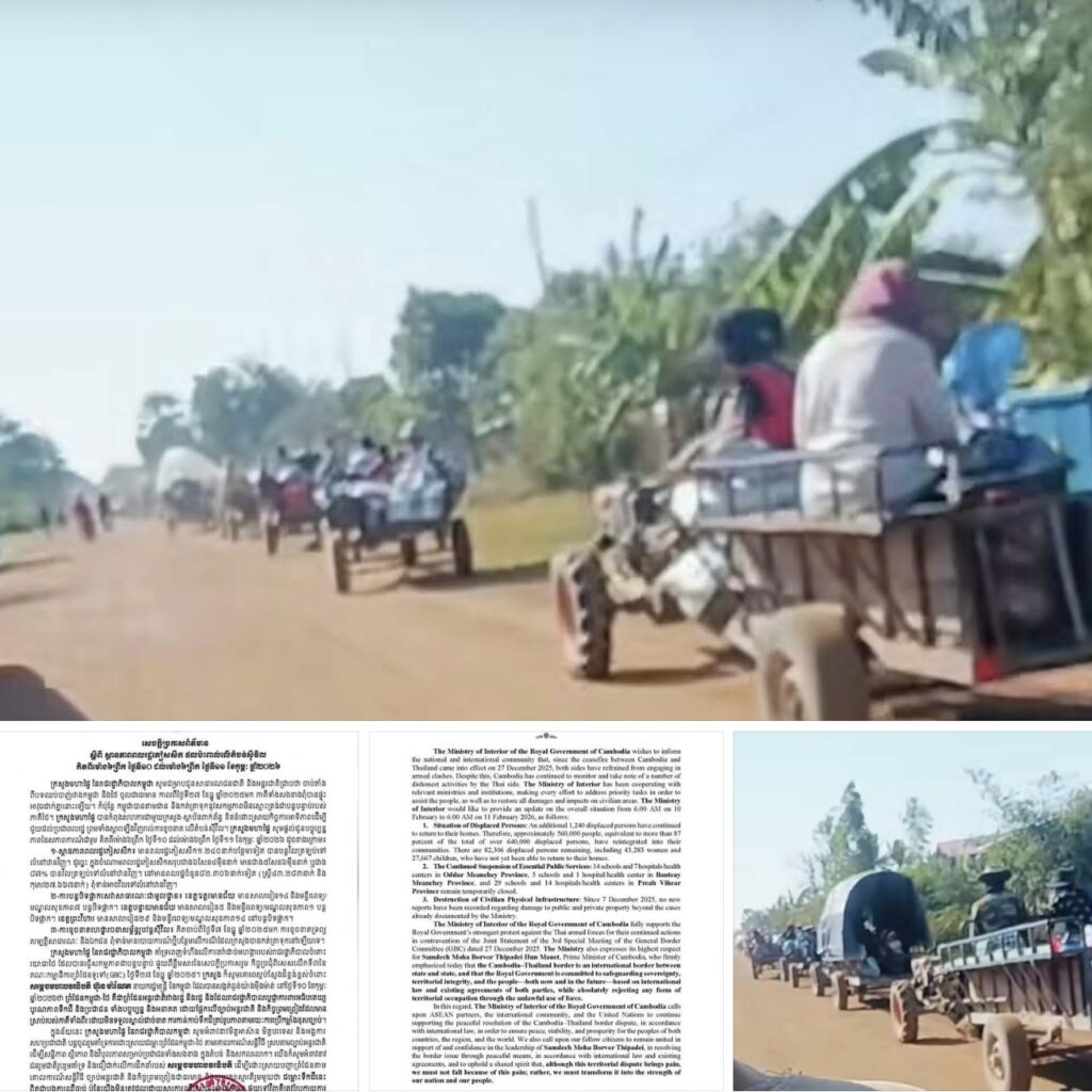 ភ្នំពេញ៖ក្រសួងមហាផ្ទៃ នៅព្រឹកថ្ងៃទី១១ ខែកុម្ភៈ ឆ្នាំ២០២៦នេះ បានឲ្យដឹងថា គិតចាប់ពីម៉ោង៦ព្រឹក ថ្ងៃទី១០ ដល់ម៉ោង៦ព្រឹក ថ្ងៃទី១១ ខែកុម្ភៈ ឆ្នាំ២០២៦នេះ មានប្រជាពលរដ្ឋភៀសសឹកសរុបជាង៦សែន៤ម៉ឺននាក់ មានប្រមាណ៥សែន៦ម៉ឺននាក់ បានវិលត្រឡប់ទៅលំនៅឋានវិញ។