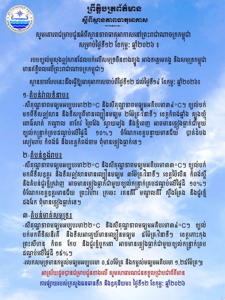 ភ្នំពេញ៖ក្រសួងធនធានទឹក និងឧតុនិយម បានចេញសេចក្តីជូនដំណឹង អំពីស្ថានភាពធាតុអាកាសនៅកម្ពុជា សម្រាប់ថ្ងៃទី១២ ខែកុម្ភៈ ឆ្នាំ២០២៦។