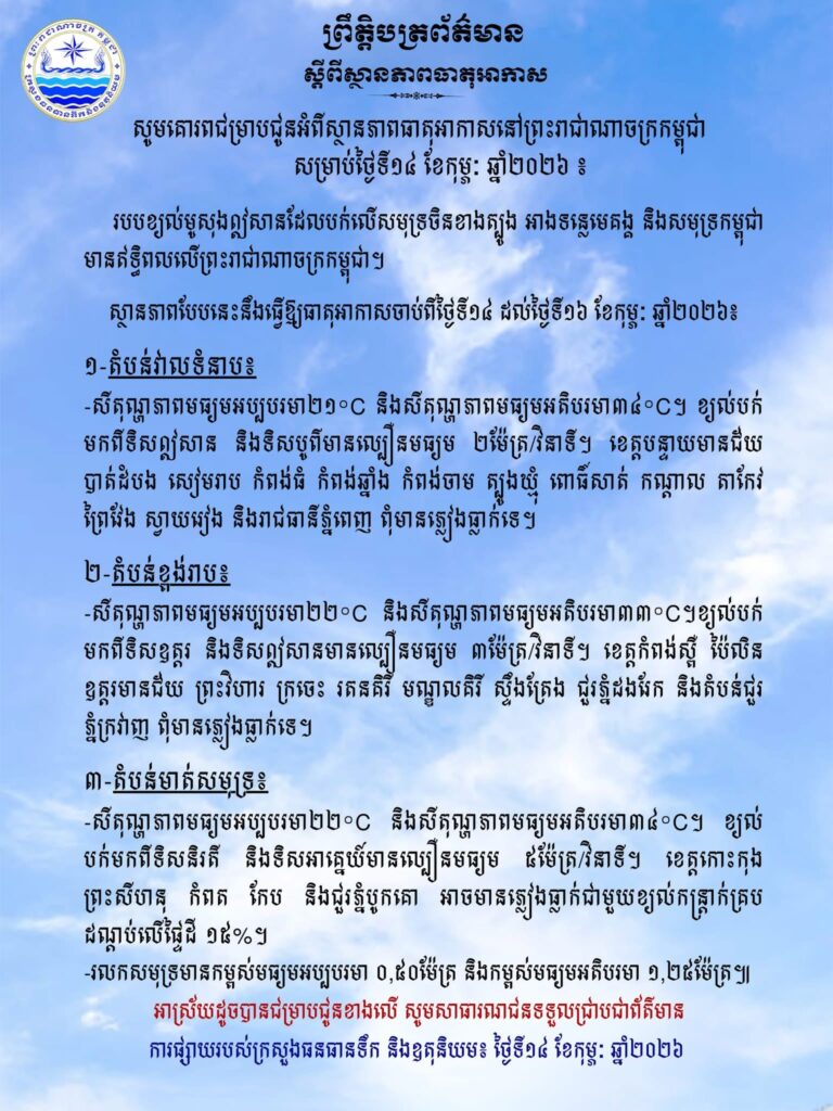 ភ្នំពេញ៖ក្រសួងធនធានទឹក និងឧតុនិយម បានចេញសេចក្តីជូនដំណឹង អំពីស្ថានភាពធាតុអាកាសនៅកម្ពុជា សម្រាប់ថ្ងៃទី១៤ ខែកុម្ភៈ ឆ្នាំ២០២៦។