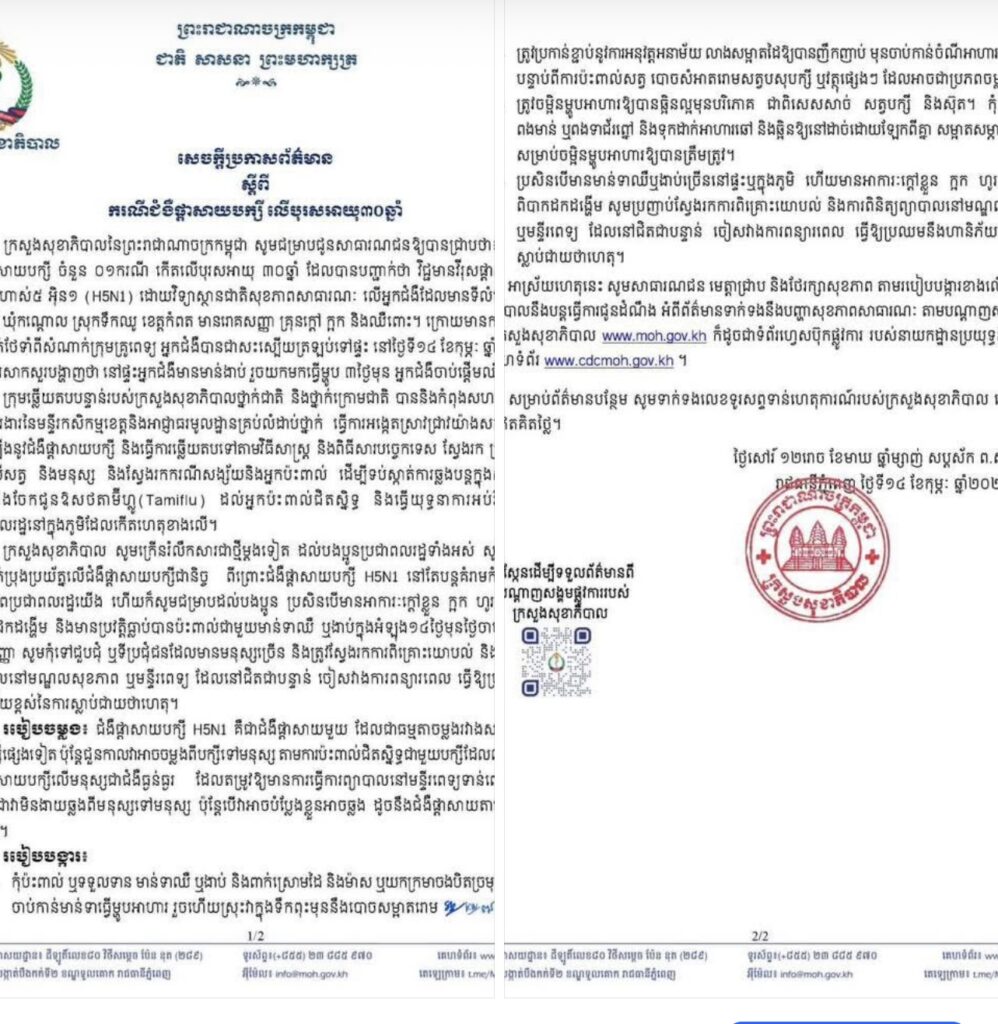 ក្រសួងសុខាភិបាល ប្រកាសរកឃើញករណីជំងឺផ្តាសាយបក្សី លើបុរសអាយុ៣០ឆ្នាំ រស់នៅស្រុកទឹកឈូ ខេត្តកំពត