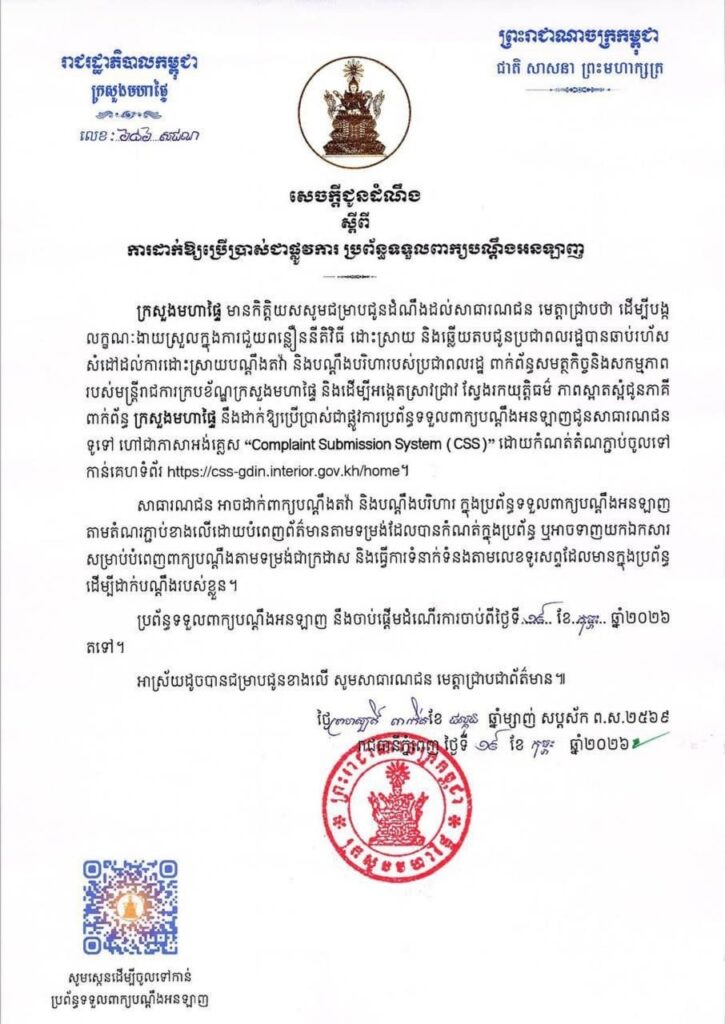 ភ្នំពេញដើម្បីបង្កលក្ខណៈងាយស្រួល ក្នុងការជួយពន្លឿននីតិវិធី ដោះស្រាយ និងឆ្លើយតបជូនប្រជាពលរដ្ឋបានឆាប់រហ័ស សំដៅដល់ការដោះស្រាយបណ្តឹងតវ៉ា និងបណ្តឹងបរិហារបស់ប្រជាពលរដ្ឋ ពាក់ព័ន្ធសមត្ថកិច្ចនិងសកម្មភាព របស់មន្ត្រីរាជការក្របខ័ណ្ឌក្រសួងមហាផ្ទៃ និងដើម្បីអង្កេតស្រាវជ្រាវ ស្វែងរកយុត្តិធម៌ ភាពស្អាតស្អំជូនភាគីពាក់ព័ន្ធ ក្រសួងមហាផ្ទៃ នឹងដាក់ឱ្យប្រើប្រាស់ជាផ្លូវការប្រព័ន្ធទទួលពាក្យបណ្តឹងអនឡាញជូនសាធារណជនទូទៅ ហៅជាភាសាអង់គ្លេស «Complaint Submission System (CSS)»» ដោយកំណត់តំណភ្ជាប់ចូលទៅ កាន់គេហទំព័រ https://css-gdin.interior.gov.kh/home។