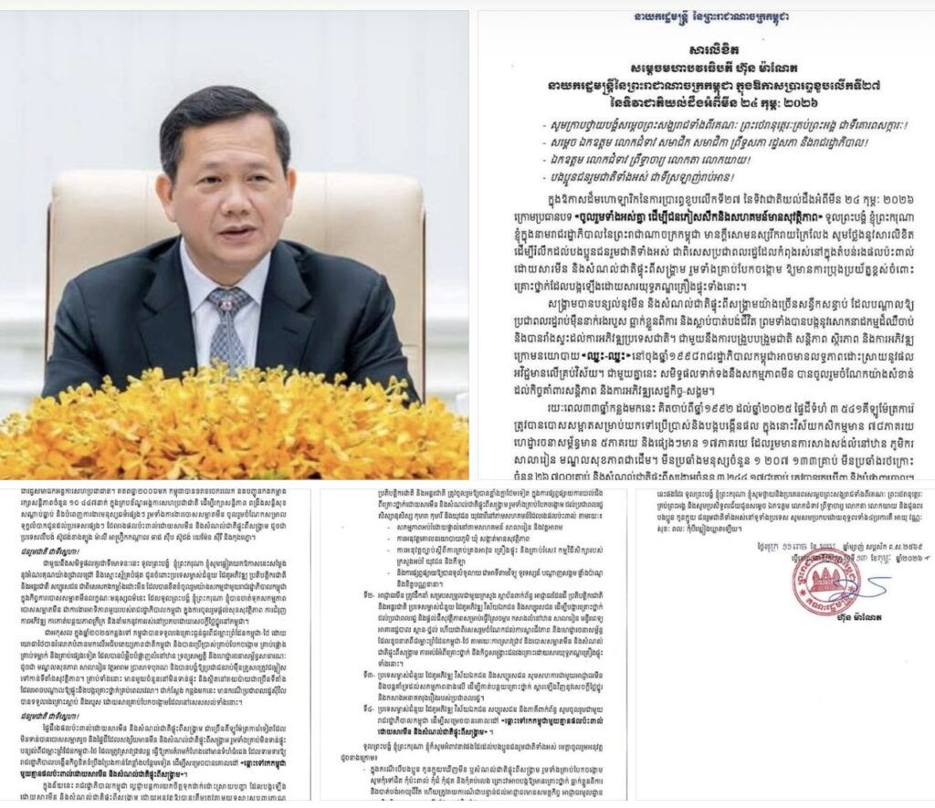 ភ្នំពេញ៖តាមរយៈសារលិខិតក្នុងឱកាសប្រារព្ធខួបលើកទី២៧ នៃទិវាជាតិយល់ដឹងអំពីមីន ២៤ កុម្ភៈ ២០២៦, សម្តេចបវរធិបតី ហ៊ុន ម៉ាណែត នាយករដ្ឋមន្ត្រីនៃកម្ពុជា បានក្រើនរំលឹកដល់បងប្អូនជនរួមជាតិទាំងអស់ ជាពិសេសប្រជាពលរដ្ឋដែលកំពុងរស់នៅក្នុងតំបន់រងផលប៉ះពាល់ដោយសារមីន និងសំណល់ជាតិផ្ទុះពីសង្គ្រាម រួមទាំងគ្រាប់បែកចង្កោម ឱ្យមានការប្រុងប្រយ័ត្នខ្ពស់ ចំពោះគ្រោះថ្នាក់ដែលបង្កឡើងដោយសារយុទ្ធភណ្ឌគ្រឿងផ្ទុះទាំងនោះ។