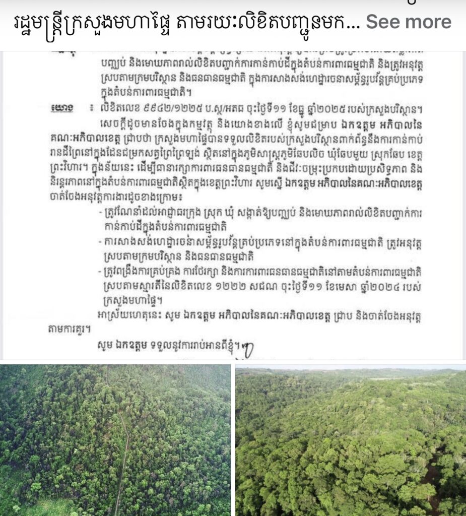ភ្នំពេញ៖ឯកឧត្ដមអភិសន្តិបណ្ឌិត ស សុខា ឧបនាយករដ្ឋមន្ត្រី រដ្ឋមន្ត្រីក្រសួងមហាផ្ទៃ តាមរយៈលិខិតបញ្ជូនមកអភិបាលខេត្តព្រះវិហារ ឱ្យណែនាំដល់អាជ្ញាធរក្រុង ស្រុក ឃុំ សង្កាត់ឱ្យបញ្ឈប់ និងមោឃភាពរាល់លិខិតបញ្ជាក់ការកាន់កាប់ដីក្នុងតំបន់ការពារធម្មជាតិ, ការសាងសង់ហេដ្ឋារចនាសម្ព័ន្ធរូបវ័ន្តគ្រប់ប្រភេទនៅក្នុងតំបន់ការពារធម្មជាតិ ត្រូវអនុវត្តស្របតាមក្រមបរិស្ថាន និងធនធានធម្មជាតិ, ត្រូវពង្រឹងការគ្រប់គ្រង ការថែរក្សា និងការការពារធនធានធម្មជាតិ នៅតាមតំបន់ការពារធម្មជាតិ ស្របតាមស្មារតីនៃលិខិតលេខ ១២២២ សជណ ចុះថ្ងៃទី១១ ខែមេសា ឆ្នាំ២០២៤ របស់ក្រសួងមហាផ្ទៃ។