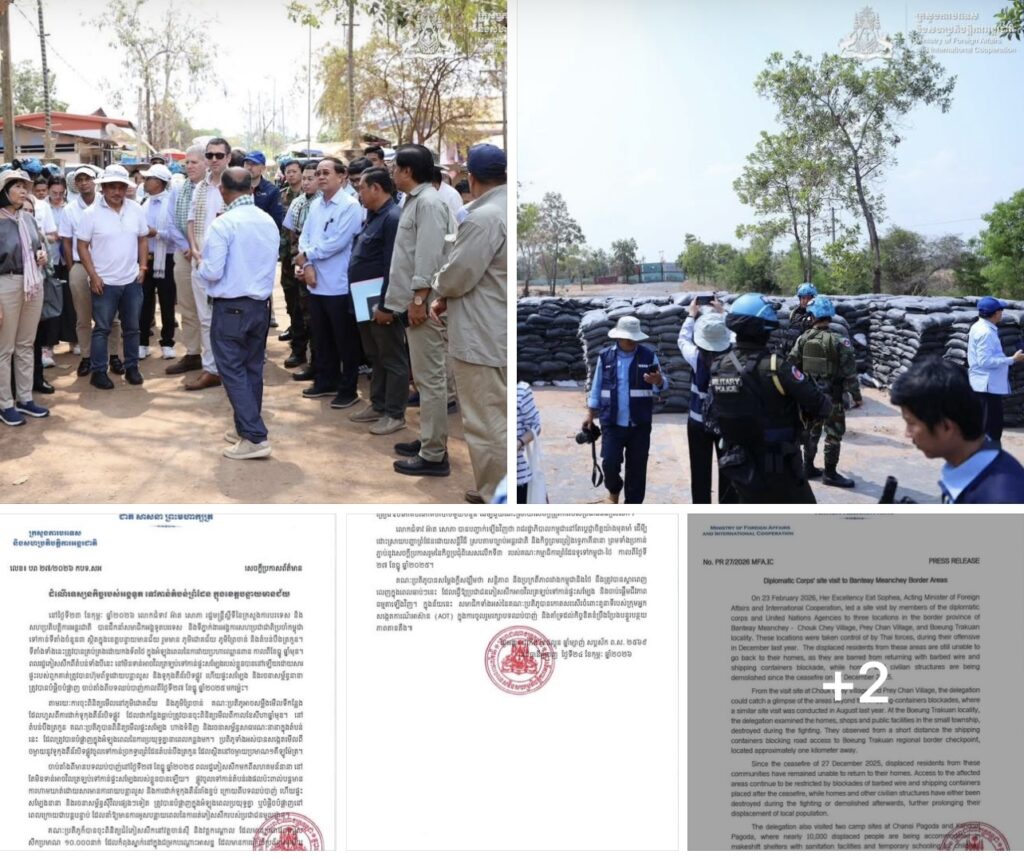 នៅថ្ងៃទី២៣ ខែកុម្ភៈ ឆ្នាំ២០២៦ លោកជំទាវ អ៊ាត សោភា រដ្ឋមន្ត្រីស្តីទីនៃក្រសួងការបរទេស និង សហប្រតិបត្តិការអន្តរជាតិ បានដឹកនាំសមាជិកអង្គទូតបរទេស និងទីភ្នាក់ងារអង្គការសហប្រជាជាតិប្រចាំកម្ពុជា ទៅកាន់ទីតាំងចំនួន៣ ស្ថិតក្នុងខេត្តបន្ទាយមានជ័យ រួមមាន ភូមិជោគជ័យ ភូមិព្រៃចាន់ និងតំបន់បឹងត្រកួន។ ទីតាំងទាំងនេះត្រូវបានគ្រប់គ្រងដោយកងទ័ពថៃ ក្នុងអំឡុងពេលនៃការវាយប្រហារឈ្លានពាន កាលពីខែធ្នូ ឆ្នាំមុន។ ពលរដ្ឋភៀសសឹកពីតំបន់ទាំងបីនេះ នៅមិនទាន់អាចវិលត្រឡប់ទៅកាន់ផ្ទះសម្បែងរបស់ខ្លួនបាននៅឡើយដោយសារ ផ្ទះរបស់ពួកគាត់ត្រូវបានហ៊ុមព័ទ្ធដោយបន្លាលួស និងទូកុងតឺន័របិទផ្លូវ ហើយផ្ទះសម្បែង និងរចនាសម្ព័ន្ធនានា ត្រូវបានបំផ្លិចបំផ្លាញ ចាប់តាំងពីបទឈប់បាញ់កាលពីថ្ងៃទី២៧ ខែធ្នូ ឆ្នាំ២០២៥ មកម៉្លេះ។