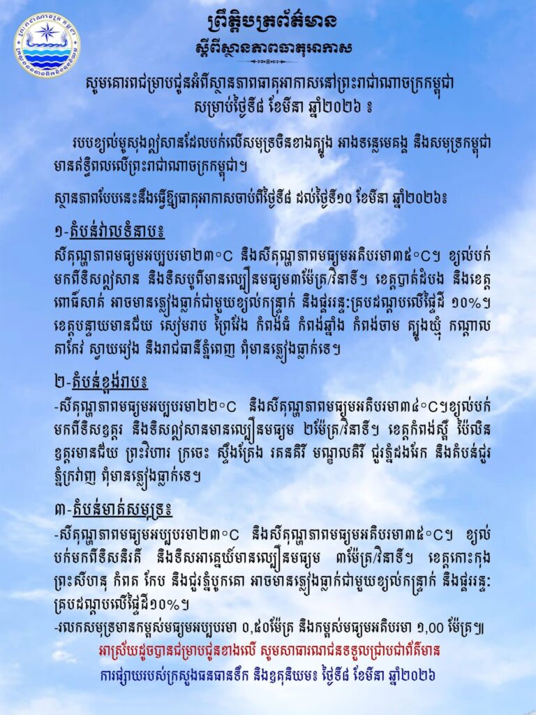 ភ្នំពេញ៖ក្រសួងធនធានទឹក និងឧតុនិយម បានចេញសេចក្តីជូនដំណឹង អំពីស្ថានភាពធាតុអាកាសនៅកម្ពុជា សម្រាប់ថ្ងៃទី៨ ខែមីនា ឆ្នាំ២០២៦។