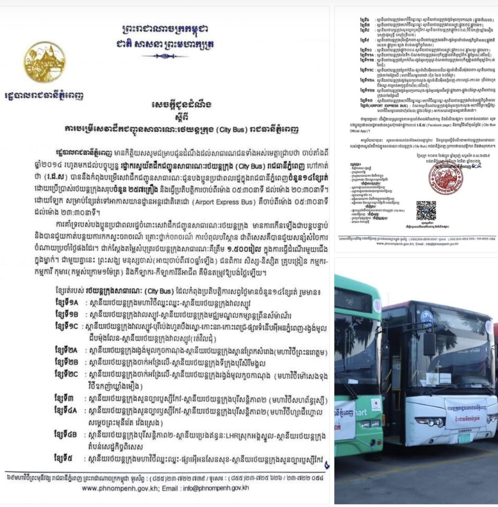 រដ្ឋបាលរាជធានីភ្នំពេញជូនដំណឹងស្ដីពីការបម្រេីសេវាដឹកជញ្ជូនសាធារណៈរថយន្តក្រុង (City Bus)