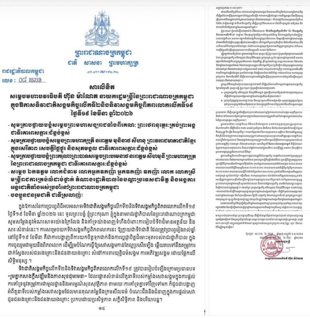 ភ្នំពេញសម្តេចមហាបវរធិបតី ហ៊ុន ម៉ាណែត នាយករដ្ឋមន្ត្រីនៃព្រះរាជាណាចក្រកម្ពុជា បានចេញសារលិខិតអបអរសាទរ ក្នុងឱកាសទិវាជាតិសង្គមកិច្ចលើកទី២ និងទិវាសង្គមកិច្ចពិភពលោកលើកទី១៩ ថ្ងៃទី១៩ ខែមីនា ឆ្នាំ២០២៦។